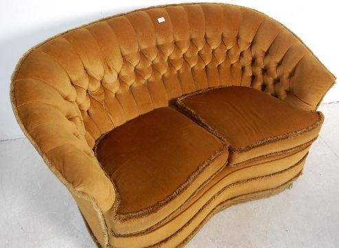 An Art Deco circa mid 20th century Victoria style two seater sofa settee. The sofa being updated in yellow fabric with button backrest, shaped arms, detachable cushion raised on casters. Measures 83 x 149 x 79cm.
