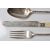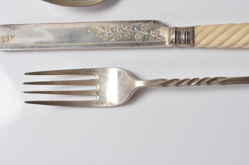 An antique Victorian hallmarked sterling silver children's cutlery set comprising of knife, fork and spoon set within a plush case. Bearing hallmarks for Sheffield, 1894, Horton & Allday. Case measures 23cm wide