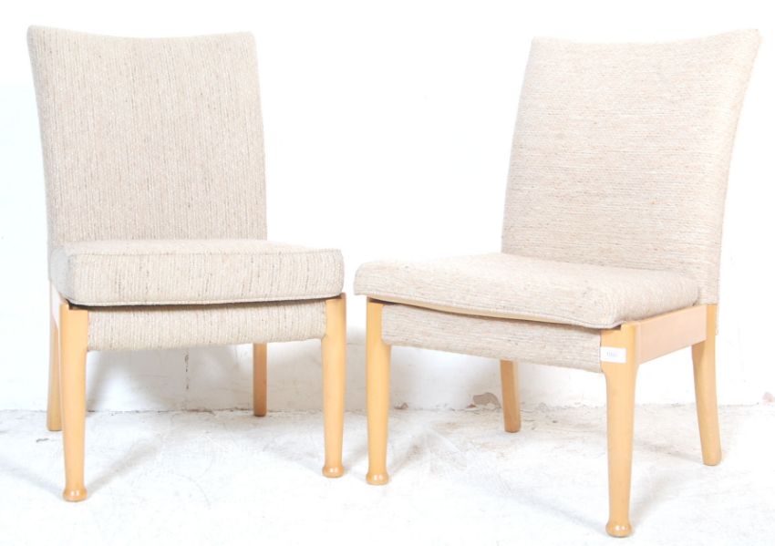 A pair of vintage Parker Knoll chairs having a beige upholstery to the seat and backrest raised on turned beech wood legs.