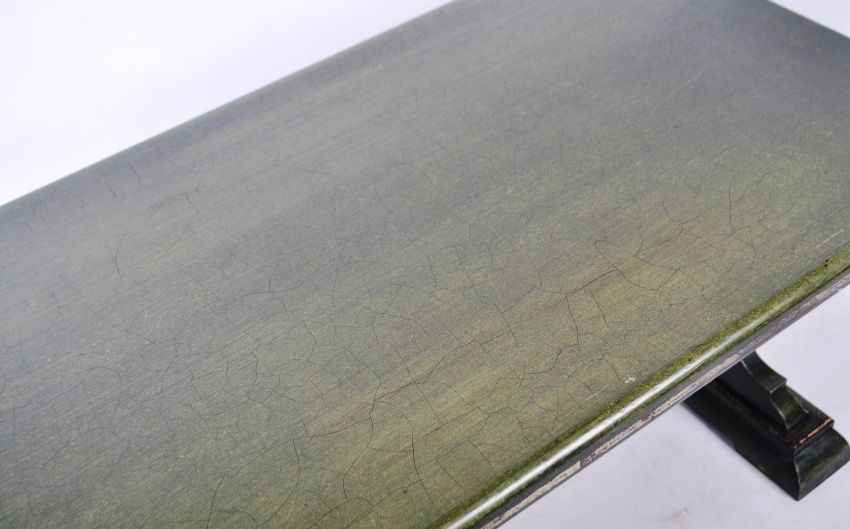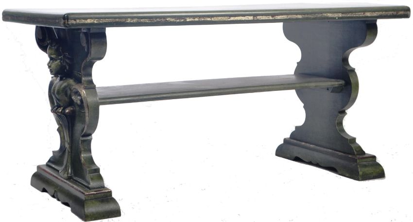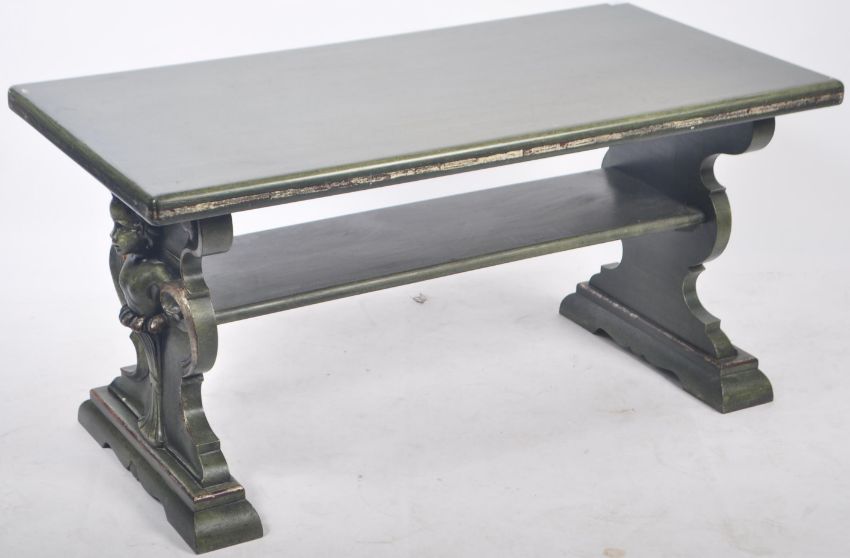 An antique style 20th Century coffee table / centre occasional table of Rococo influence. The table of carved wood construction having a large rectangular top supported by two carved cherub and scroll sides united by a single second tier shelf. All raised upon trestle feet supports and finished in apple green. Measures approx 60cm x 122cm x 63cm.