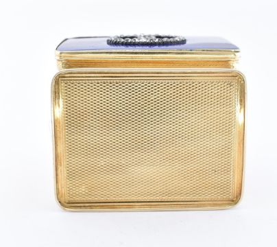 An 18ct gold enamel and diamond vinaigrette. The vinaigrette having a sunburst blue enamel lid set with old cut diamonds with monogram ' R ' to centre. of the lid. The lid opening to reveal a pierced floral compartment to plain interior.  Engine turned to base and sides.  Tests indicate 18ct gold. Weight 43g / Measures 4.5cm x 3.5cm x 12mm