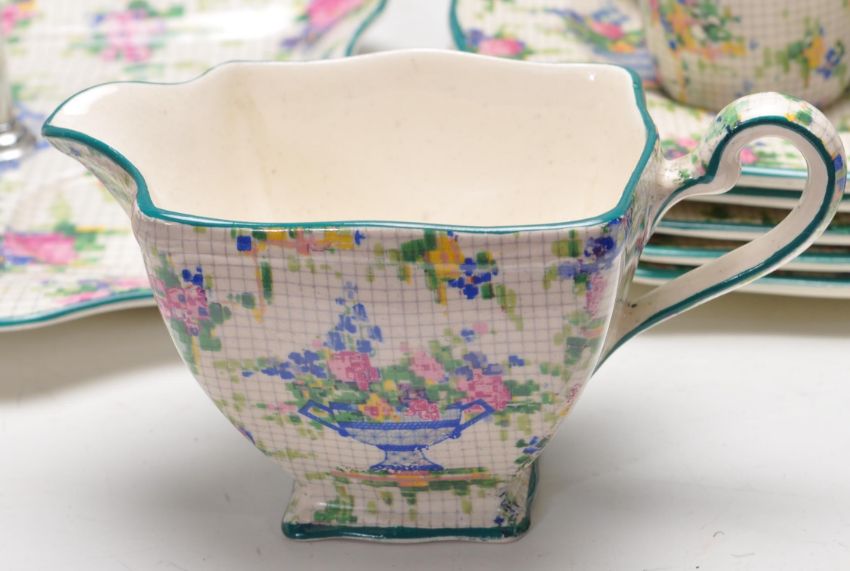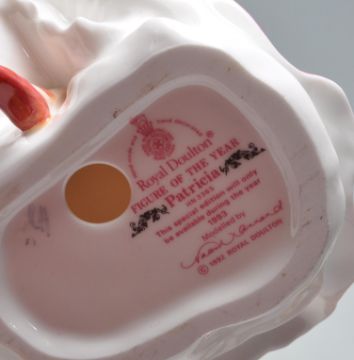 A collection of vintage 20th century bone china to include a Royal Winton Chintz Petit Point egg cup set with jug and bowl, a Royal Doulton figurine - Patricia Figurine of the Year, Royal Crown Derby Large Candlestick, Wedgwood, Copeland Spode blue and white lidded jug decorated with rural scenes, Wedgwood Vase and more. Signs of wear and tear commensurate with its age. Candlestick Measures 27cm high.
