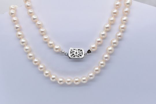 An 18ct gold sapphire single strand pearl necklace. The necklace having a single  row of cultured pearls united by textured white gold box clasp set with 8 round mixed cut sapphire.  Marked 750 to fastener. Measures approx  70cms. Weight approx 48.7g. Pearls approx 7mm round.