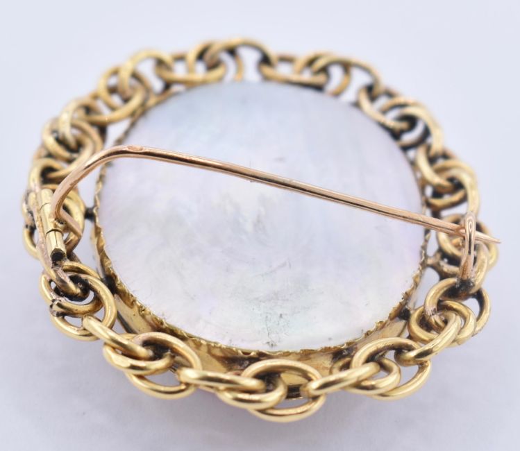 A 19th century French hard stone cameo brooch pin. The brooch having a carved cameo of a lady, collet set within a gold mount having stylised chain decorated border. The brooch completed with mother of pearl back and C clasp verso. French eagle mark to mount and fastener. Weight 22.8g. Measures approx 5cm  x 4cm