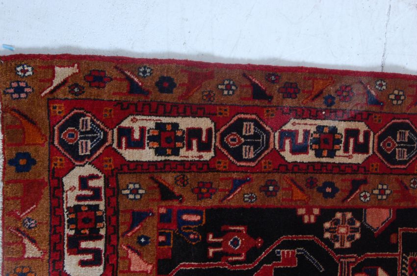 An impressive 20th century Persian / Iranian Hand-Knotted Nahavand rug having a large single central medallion with smaller nomadic motifs surrounding it on a dark blue / black field with geometrical main border, tribal / nomad motifs to the inner and outer boarder with white fringe to the top end and bottom end. Fine quantity.