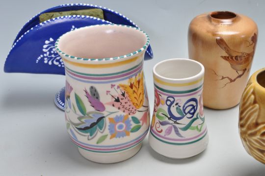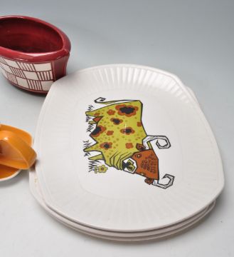 A collection of vintage 20th century ceramic table ware and cabinet ware to include three Beefeater plates, Susie cooper plate, Poole England creamer jug, vases, Sylvac ceramic planter, etc. 23cm tall.