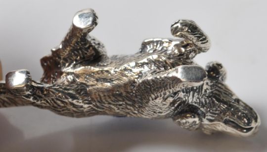 A vintage style stamped sterling silver pin cushion in the form of a spaniel dog having a navy blue felt cushion to the back and engraved features. Stamped sterling to the inside of the hind leg. Measures 44mm in length. Total weight 12g.