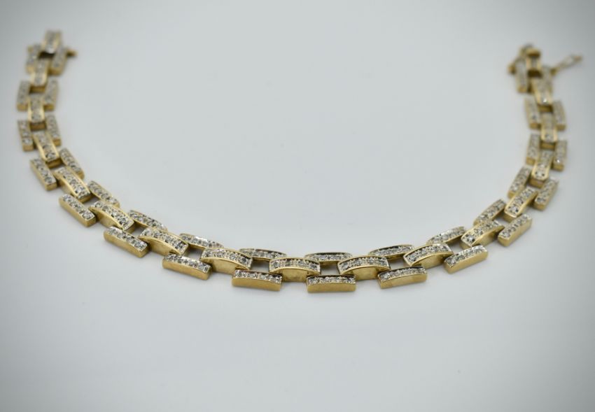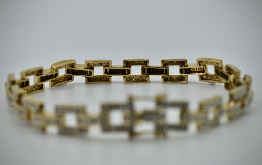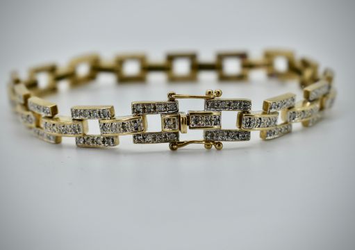 A 9ct  yellow gold diamond bracelet. Hallmarked for London, the links of tank form being  inset with round single cut diamonds. Estimated diamond weight approx. 1.5cts – 2.0cts. Total weight 14.21g / Length 19cm