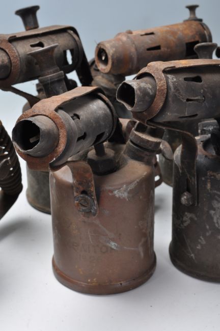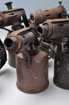 A large collection of vintage retro 20th century brass paraffin blowtorch lamps of various sizes and shapes to include makes as Burmos, Primus, etc. 20cm tall