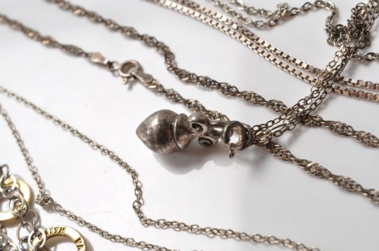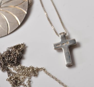 A collection of stamped 925 silver chain necklaces and pendants, to include an enamelled St Christopher pendant, a circular locket, an engraved boat pendant, a crucifix and several chain necklaces. Total gross weight 78 grams.