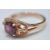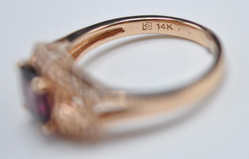 A 10ct rose gold having a central faceted garnet with pierced shoulders decorated with white sapphires. Ring size N. Gross weight 3.89g. Tests indicate 10ct gold.