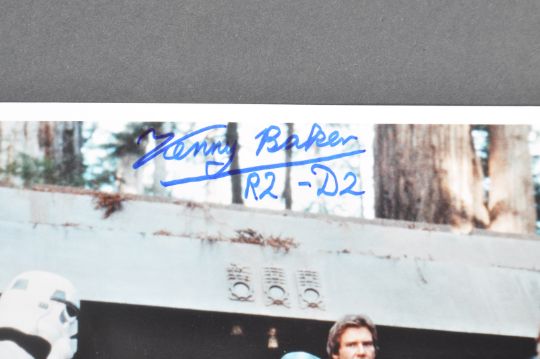 Estate of Dave Prowse - Star Wars - Kenny Baker 1934-2016 (R2D2) - autographed 8x10" colour photograph from Return Of The Jedi. Signed in blue ink to a light portion of the image, with character name. Obtained personally by Mr Prowse. Unusual as Mr Baker does not actually feature in the image. Some light creases to the photo, would benefit from framing.