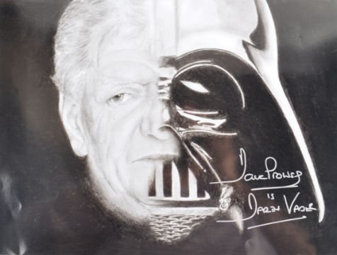 Estate of Dave Prowse - Star Wars - Dave Prowse 1935-2020 - an autographed 14x18" black and white artwork print, based on an original sketch of a half-Prowse-half-Darth-Vader artwork piece. Unknown artist. Hand signed by Mr Prowse in silver ink to a dark portion, adding 'Is Darth Vader'. Large autograph. Unframed.