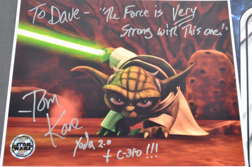 Estate of Dave Prowse - Star Wars The Clone Wars - two autographed 8x10" colour photographs from the franchise. The first an Official Pix photograph signed to Mr Prowse ' To Dave Umm..yes! Strong with the Dark Side, you are!'. The second and officially licensed photograph signed ' To Dave - The Force is VERY strong with this one! '. Both with character names added and signed in silver. Obtained personally by Mr Prowse.