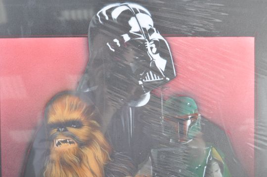 Estate of Dave Prowse - Star Wars - Michael McDaniel (Comic Art) ' Men Behind The Masks ' - an original mixed media painting on card artwork featuring Darth Vader, Chewbacca, Wicket, R2D2 and Boba Fett. Impressive piece of artwork. Professionally mounted, ready for framing. Still housed in original cellophane. As gifted to Mr Prowse by the artist. Total size; 71cm x 51cm.