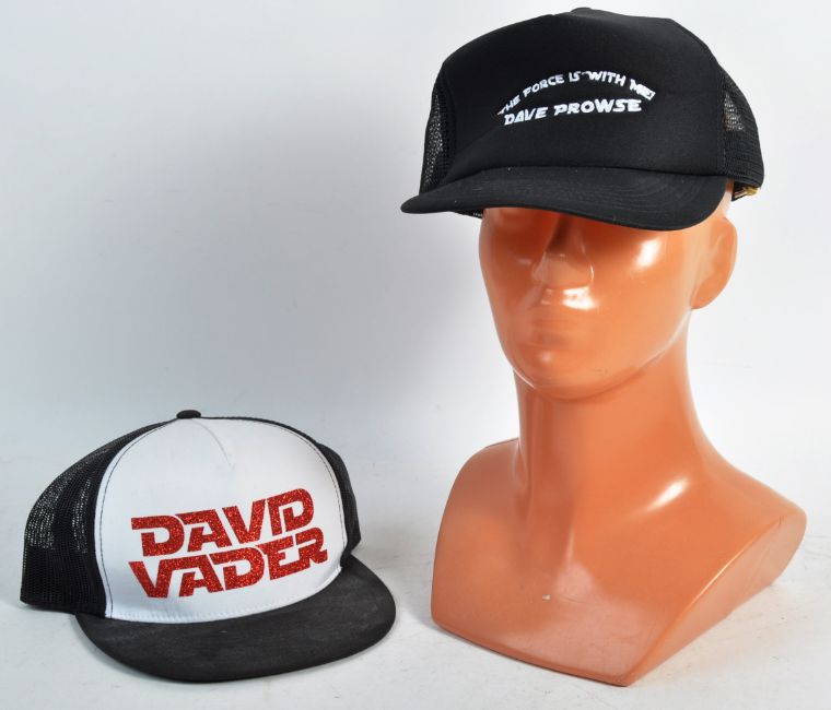 Estate of Dave Prowse - x2 of Mr Prowse's personally owned Star Wars related baseball caps. The first embroidered to the front ; The Force Is With Me - Dave Prowse and the other in glittering red ' David Vader '. Both generally in excellent used condition, a little dusty from display. Worn by Mr Prowse.