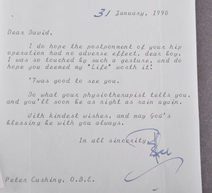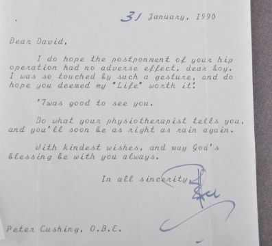 Estate of Dave Prowse - Peter Cushing (1913-1994) - Grand Moff Tarkin in Star Wars - personal letters between Cushing and Prowse - two personally written letters from Cushing to Prowse in the 1990s. The first dated 31st January 1990 and speaks to Prowse about the postponement of his hip operation, with Cushing offering some advice. The second is dated 21st December 1992 and talks of an ankle injury and a new 'enterprise' that Prowse is undertaking. Both signed by Cushing in fountain pen ink. Each oddly cut, the largest 13x15cm. Unique personal inter-cast correspondence.
