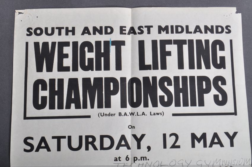 Estate of Dave Prowse - Weightlifting Poster - an original early 1960s (believed 1964 / 65 ' South And Eat Midlands Weight Lifting Championships ' event poster from College Of Further Education, Oxford. Black notation on a white ground. Printers marks for Seacourt Press, Oxford. Pencil correction ' Technology Gymnasium '. Mr Prowse listed as ' D. Prowse - Wales '. Folded. Measures approx; 50cm x 38cm.