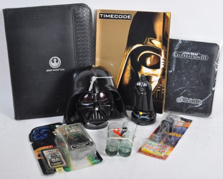 Estate of Dave Prowse - Star Wars - a collection of assorted Star Wars memorabilia items to include; a Hasbro Darth Vader Flashback Photo action figure (slightly crushed), a Darth Vader Pez Dispenser, a vintage Wesco Darth Vader wall clock (lacking battery cover),  a Star Wars CCG leatherette collector's case, a pair of shot glasses, a Star Wars Celebration III guest's exclusive notepad and other items. All from Mr Prowse's home office.