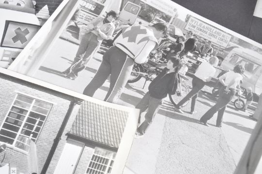 Estate of Dave Prowse - The Green Cross Code Man - a collection of x3 original vintage 1970s large format press publicity photographs showing Prowse working as The Green Cross Code Man. The first showing Mr Prowse alongside his robot assistant, the other two showing Prowse at what appears to be a motorcycle show signing autographs for children. All 16x12", one with press info to verso.