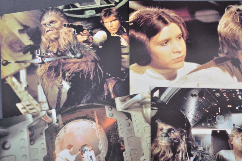 Estate of Dave Prowse - Star Wars (1977) - a set of x6 original 8X10" colour cinema lobby promotional display cards from the movie. American issue. Each showing a different scene from the iconic film, with production details to the lower edge. Generally all in excellent condition for age, and appearing undisplayed. Along with x1 black and white press photo from a different set. (7 items total).