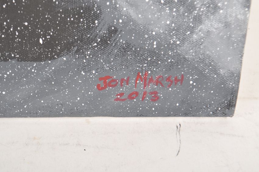 Estate of Dave Prowse - Star Wars - Fan Art - a 20th century oil & mixed media on canvas painting of Darth Vader, with a smoky backdrop and highlighted features. Signed John Marsh, dated 2013. Unframed. Total size approx; 51cm x 41cm.