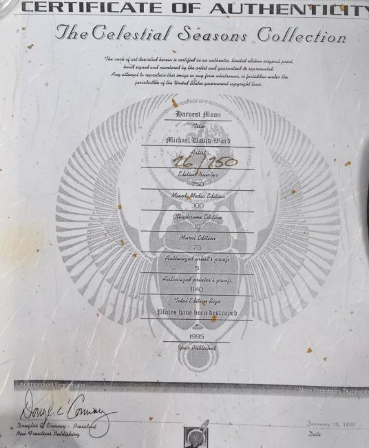 Estate of Dave Prowse - Michael David Ward - Harvest Moon (1995) - a limited edition colour lithograph Cosmos related print. Limited No. 26/750, c1995. Signed by the artist to the corner. Rolled. With certificate of authenticity. Measures approx 43cm x 59cm.