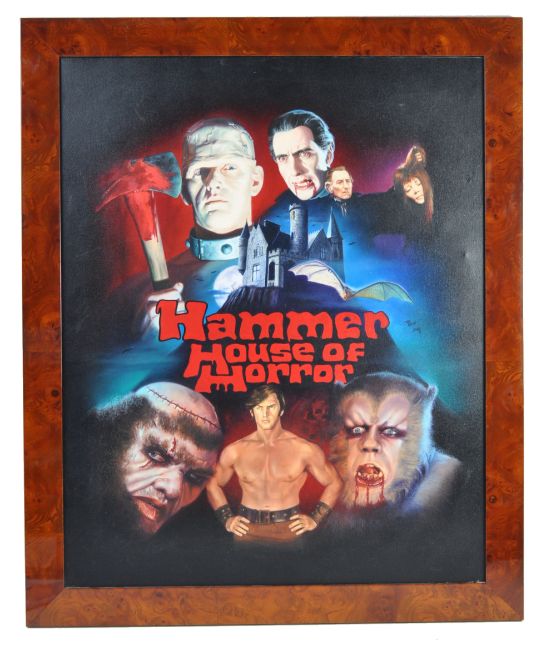 Estate of Dave Prowse - Hammer House of Horror - original painting by George Arthur Bush - an incredible mixed media on canvas painting depicting all of Mr Prowse's roles within the franchise. Specially commissioned for Mr Prowse by the artist. Red painted text to centre, and signed to corner by artist. Framed in a decorative wooden frame, with artist details to reverse. A unique piece of Hammer Horror / Dave Prowse memorabilia. Total size 87cm x 71cm.