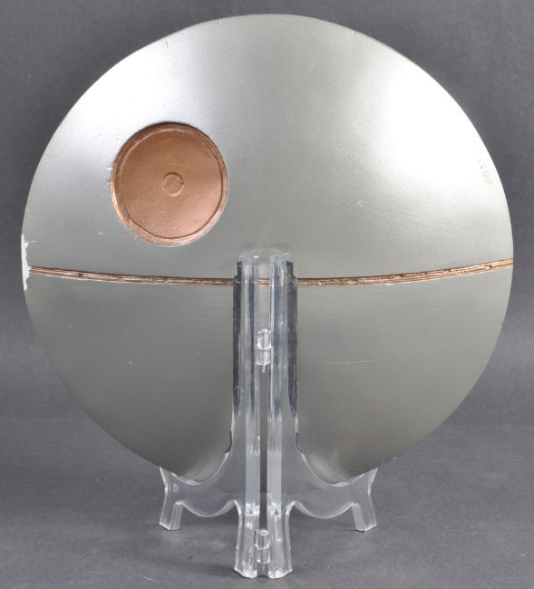 Estate of Dave Prowse - Star Wars - an original fan-made Darth Vader Death Star presentation plaque with display stand. The plaque of plaster construction hand painted to the front with Darth Vader flanked by 2 Stormtroopers surrounded by the text ' Darth Vader Is David Prowse '. The reverse resembling the exterior of the Death Star. Signed by fan named Mike 2014. Measures approx 25cm