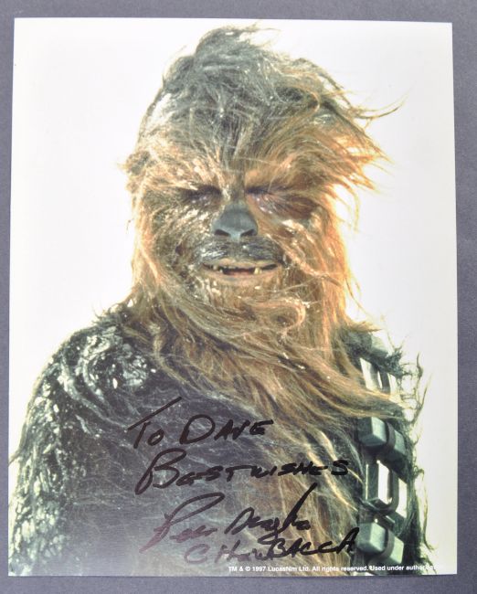 Estate of Dave Prowse - Star Wars - Peter Mayhew (1944-2019) - Chewbacca - autographed official Lucasfilm Ltd  8x10" colour photograph of Mayhew as Chewbacca. Signed in black ink to a central portion of the image and dedicated ' To Dave ', with character name added. Obtained personally by Mr Prowse.