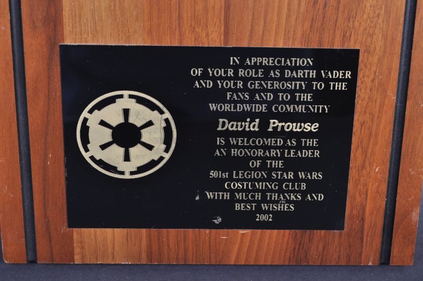 Estate of Dave Prowse - Star Wars - an original 501st Legion presentation plaque to Mr Prowse. The engraved brass plaque to base reads ' In Appreciation Of Your Role As Darth Vader And Your Generosity To The Fans And To The Worldwide Community - David Prowse - Is Welcomed As The Honorary Leader Of The 501st Legion....2002 '. With an embroidered patch. Mounted on an oak frame. Total size 31cm x 23cm.