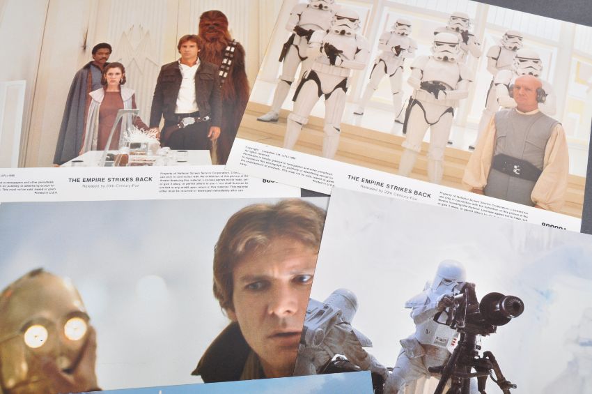 Estate of Dave Prowse - Star Wars - The Empire Strikes Back (1980) - a set of seven original 8x10" colour cinema lobby promotional display cards from the movie. British issue. Each showing a different scene from the iconic film, with production details to the lower edge. Generally all in excellent condition for age.