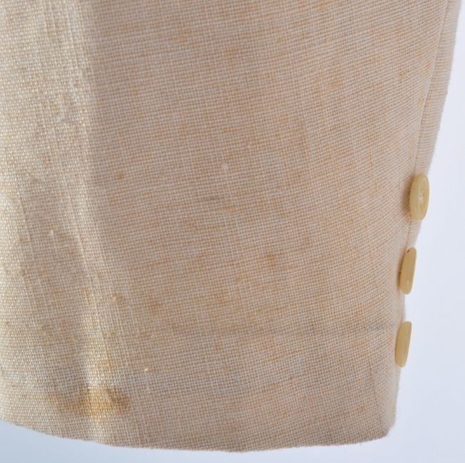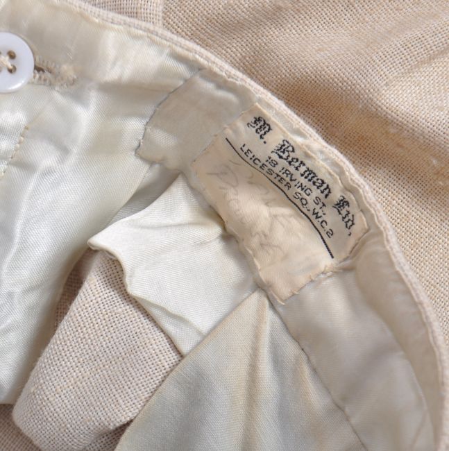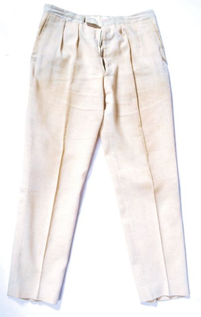 Estate of Dave Prowse - Hammerhead (1968) - an original screen worn / matched cream suit as worn by Mr Prowse in the British Spy Thriller. The cotton suit in cream, with all original buttons, twin pockets to the front and single pocket to the breast. Retains the original M. Berman label to interior, and another to the interior of the pocket - named to ' Prowse ' in blue ink. With two pairs of accompanying trousers, both also with M Berman labels and named ' Dave Prowse '. Use and discolouration to trosuers from production, but generally in good condition. No size mentioned, but jacket approx XL. Rare piece of screen used costume. Supplied with some original vintage ephemera from the movie - including an original lobby card showing Prowse in this suit, two small press brochures, and a brochure featuring Dave Prowse images from the film (seen wearing this suit).