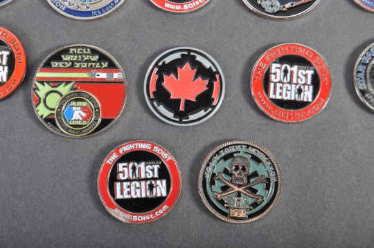 Estate of Dave Prowse - Star Wars - a collection of x12 original 501st Legion (and other) Star Wars coins / medallions. All enamel decorated with various text and imagery. As obtained / given to Mr Prowse on his travels around the world to various public appearances and conventions.