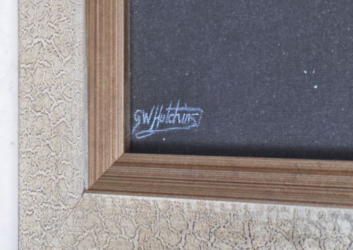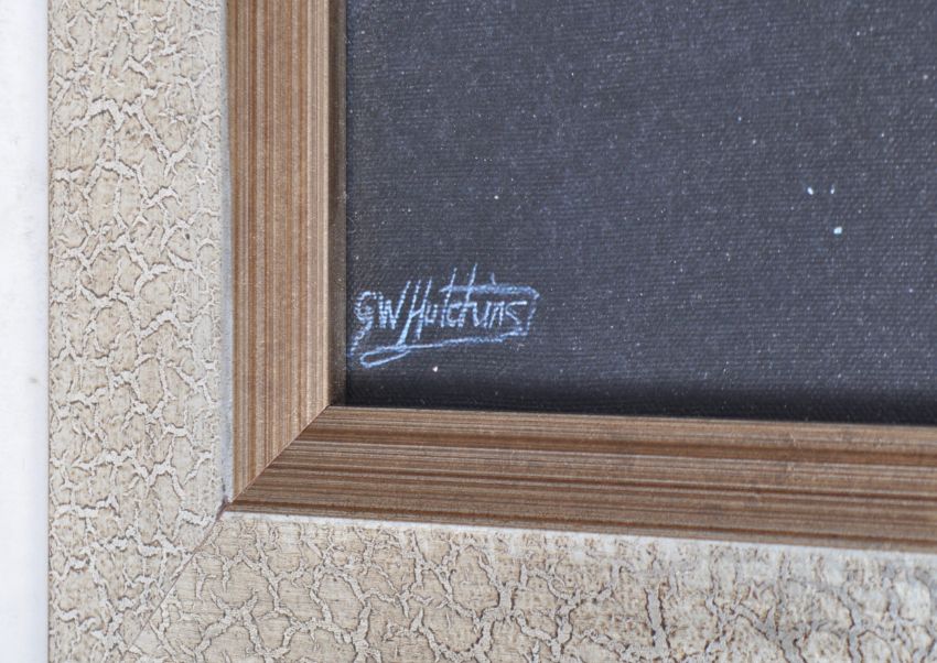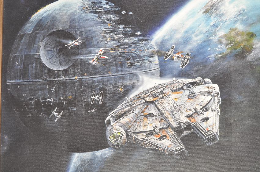 Estate of Dave Prowse - Star Wars - GW Hutchins - a canvas artwork print depicting the Millennium Falcon amidst the Death Star with various X Wings and TIE Fighters behind. Professionally framed. Total size; 63x77cm.