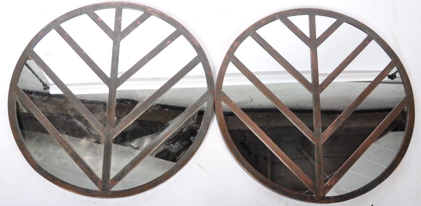 An impressive pair of original antique early 20th century Art Deco 1920's stylised bronze window frame mirrors. The once-window frames being circular, with a central lined motif running through the centre. Later repurposed into mirrors, as per their current form. An impressive pair of industrial mirrors. Each measures approx; 76cm diameter.