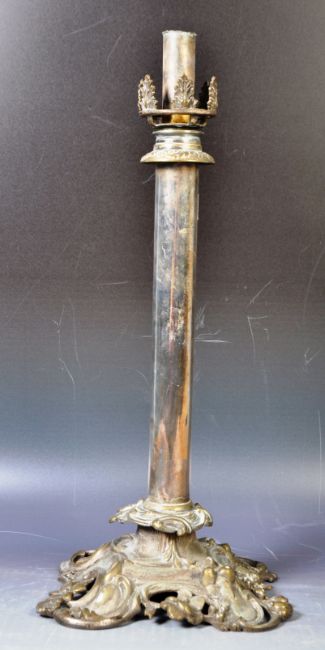 An antique 19th Century silver plated candlestick in the manner of Elkington having an ornate oak leaf top with relief decorated knop raised over a cylindrical column raised over the ornate Rococo influence 'C' scroll and floral base. Measures approx; 47cm tall.