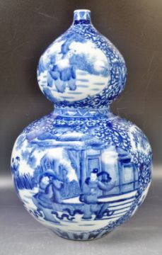 A large antique 19th Century Chinese Kangxi mark blue and white porcelain double gourd vase having hand painted decoration depicting scenes of figures in white cartouche panels with scrolling leaves throughout. Six character Kangxi reign mark to base in underglaze blue Kaishu script. Measures approx; 38cm tal. No visible damage.
