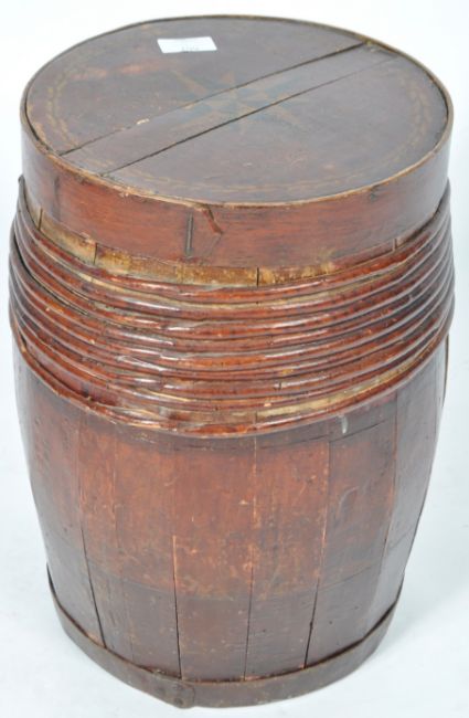 A large and impressive antique 19th Century Victorian shipping spice barrel of slatted wood construction with circular lid, bulbous body and painted cartouche panel notated ' JWS GDK '. Polychrome painted decoration throughout with star motif to lid. Measures approx; 41cm x 31cm.