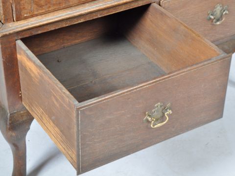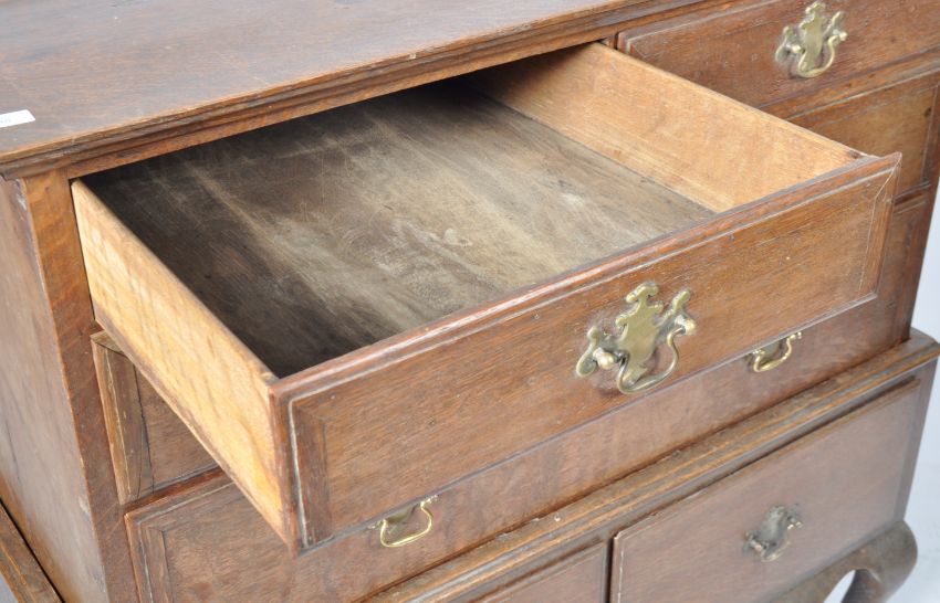 An antique early 18th Century Georgian George I oak chest on stand. The chest of drawers having a bank of two over two drawers raised on a later 19th Century stand with two drawers. Each fascia on the bank of drawers having brass armorial back plates and swing handles. All raised on short cabriole legs. Measures approx; 108cm x 105cm x 61cm.