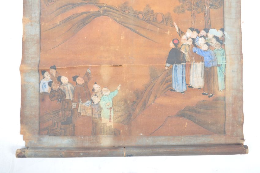 An antique 18th / 19th Century Chinese hand painted silk painting scroll depicting an elder / immortal descending from the heavens flanked by two winged angels above a crowd of onlookers among hills and mountains. Set to the original wooden sections however one has come loose but is present. A highly detailed period example. Measures approx  132cm x 72cm.