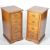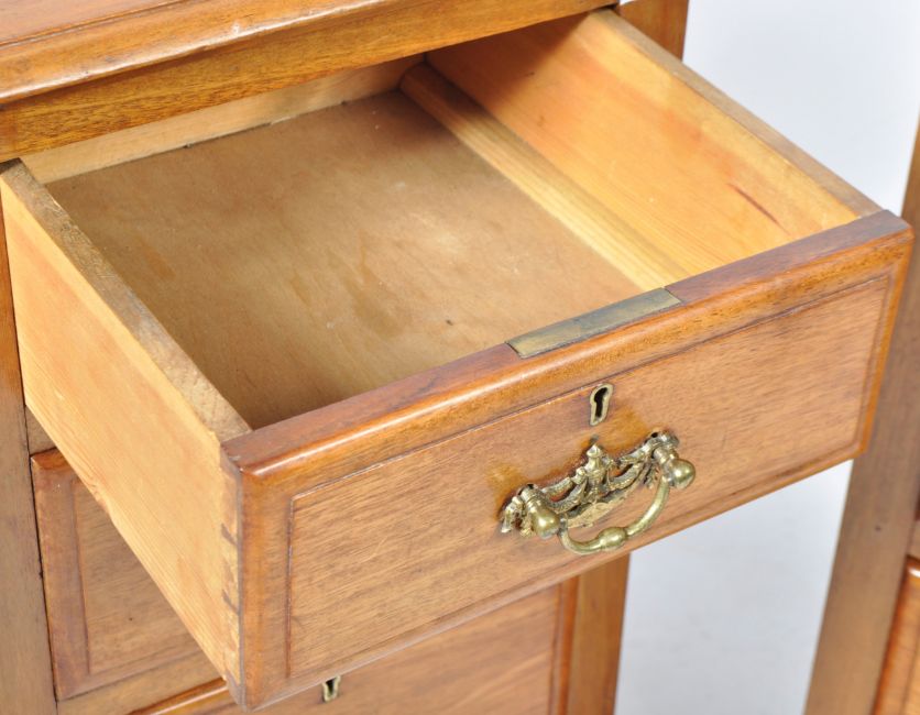 A pair of antique early 20th Century Edwardian English bedside cabinet / chests of upright pedestal form. Each of walnut construction having chamfered edge square tops with a graduating bank of four drawers, each having pierced brass backplates and drop swing handles. Raised on bracket feet supports. Each measures approx; 78cm x 39cm x 45cm.