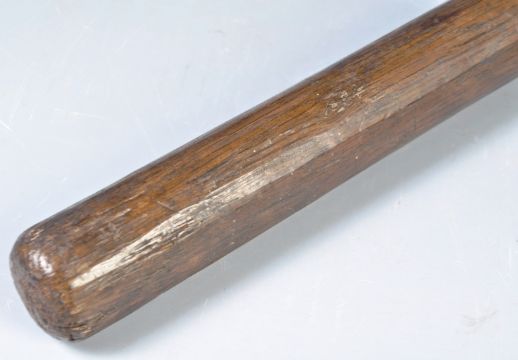 An antique 19th Century African tribal knobkerrie war club of hardwood construction having a lightly carved end with tapered shaft. Split / groove from top to half of shaft. Measures approx; 75cm long.