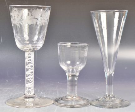 A collection of three 18th / 19th Century wine drinking glasses comprising an 18th Century Georgian firing glass, an 18th Century plain stem ale glass along with a beautifully engraved Georgian style double series opaque twist wine glass. Good collection. Largest measures 15.5cm. No visible damage.
