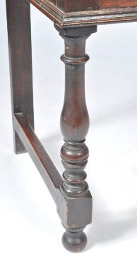 An antique late 18th Century / early 19th Century Georgian English Jacobean revival side table / serving table / dresser base sideboard of oak construction. The sideboard having two drawers with Jacobean block geometric moulded drawer fronts and central brass knob handles and brass key back plates. All being raised on block and turn supports united by stretchers. Measures approx; 81cm x 136cm x 50cm. .