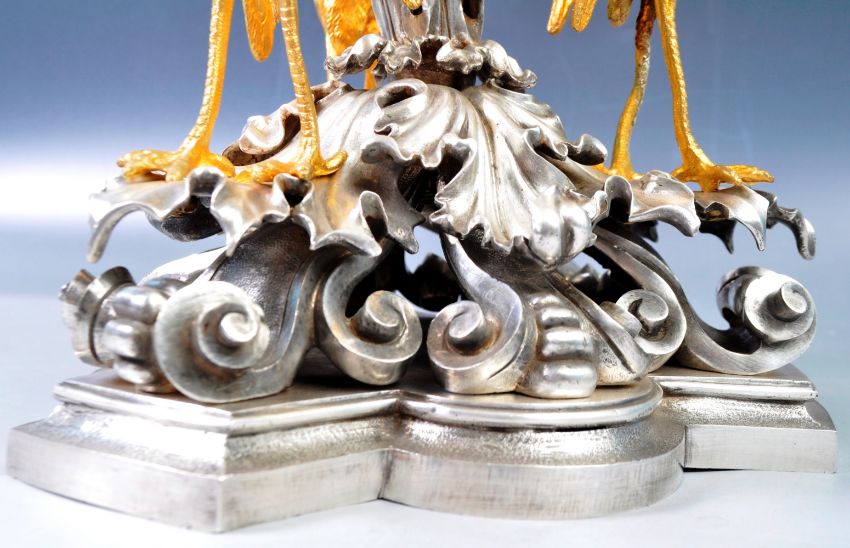 An antique19th Century silver plate and gilt two tone candelabra centerpiece in the manner of Elkington. Central leaf sconce flanked by four matching candlestick sconces raised on scrolled naturalistic branches raised over a central split branch column with further leaf and scrollwork to the base. Set with three gilded ormolu winged long necked swan birds. Truly a fantastic display piece. Measures: 66cm tall.