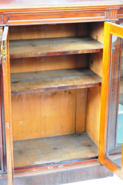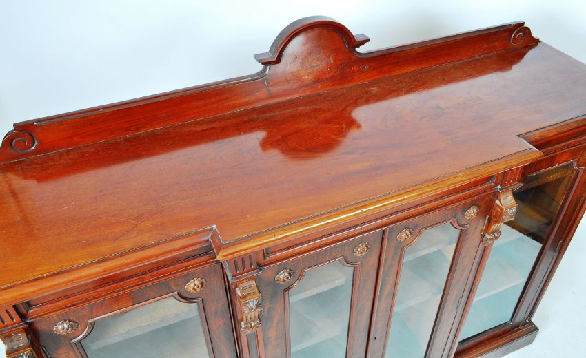 An large antique 19th Century Victorian English mahogany breakfront bookcase cabinet having and arched back rail over a chamfered edge top. Below a decorative carved freezie with flower head carved decoration with a central protruding double glazed door section with adjustable shelves within. The central cabinet flank by further glazed door components to each side with all being raised on a plinth base Measures approx; 131cm x 160cm x 47cm.