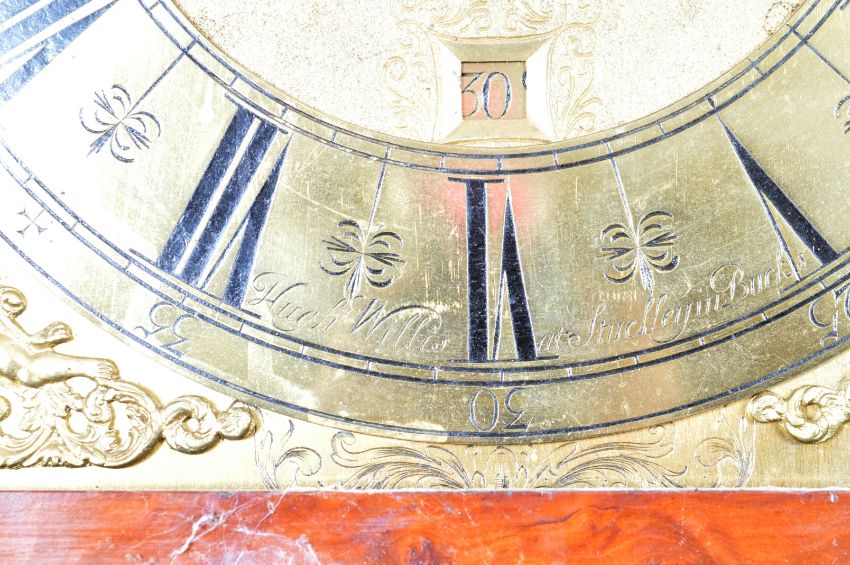 A rare antique 18th Century Georgian burl / burr yew and solid yew wood 8 Day longcase grandfather clock by Hugh Willis of Suckley in Bucks. Stepped top hood with glazed door over burr yew wood trunk case door with solid yew wood interior. The gilded brass dial of square form having ornate corner spandrels depicting cherubs holding crowns, Roman numeral chapter ring, subsidiary date aperture and faceted hands. Complete with weights and pendulum. Some age related wear to the case.  Measures approx 232cm x 44cm x 22cm. Face 12" dial 11".
