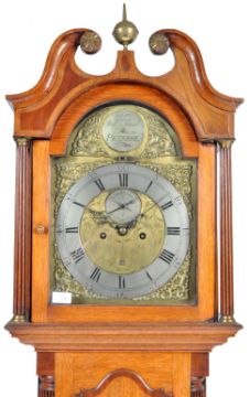 A rare 18th Century Georgian Scottish 8 day oak & mahogany cased longcase grandfather clock by William Small of Peterhead having an swan neck pediment top with brass details and glazed door flanked by reeded columns. The trunk having reeded columns and detailed door over stepped lower section. The brass face having gilt spandrels, silvered Roman Numeral chapter ring, day aperture and subsidiary dial. Measures approx; 214cm x 47cm. Dial 11" face 12".