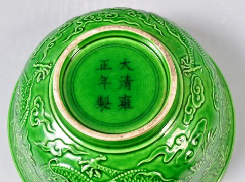 An antique 19th Century Chinese Yongzheng mark Oriental porcelain bowl having a deep jade green glaze with depictions of Imperial dragons and flaming clouds. Raised on small circular foot base. Six character Yongzheng mark in black Kaishu script. Condition approx; 8cm x 16cm.